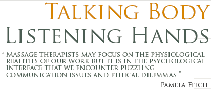 Talking Body Listening Hands 2nd Edition, a singular text on massage therapy professional practice has been adopted as the principle ethics text by the College of Massage Therapists of British Columbia. It is used by massage therapy programs and educators across Canada and the US.